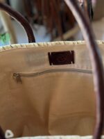 With dimensions approximately 52 cm in width, 28 cm at the base, and 35 cm in height, each bag is a testament to artisan craftsmanship, making it slightly unique in size and shape. This eco-friendly alternative to plastic bags is ethically sourced and handwoven in Morocco using wild palm “doumdoum,” with leather naturally tanned for a sustainable finish.