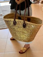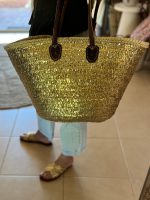 Handwoven from natural palm leaves and adorned with shimmering sequins in gold shades this spacious shopper bag exudes charm and uniqueness. Its sturdy rolled leather handles add a touch of luxury while ensuring comfortable carrying, whether you’re strolling along the shoreline or exploring local markets.