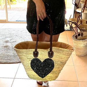 STRAW BAG TOTE – BLACK & SILVER SEQUIN HEARTS LARGE